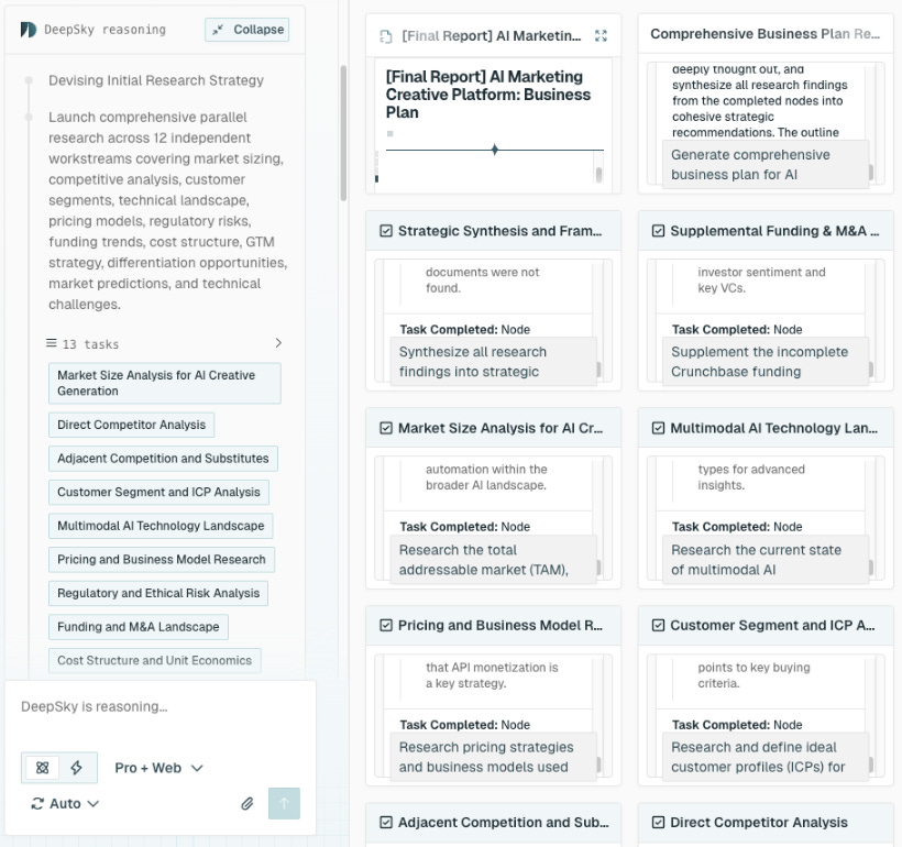 Once the plan is set, DeepSky launches parallel research threads across every branch of the topic.