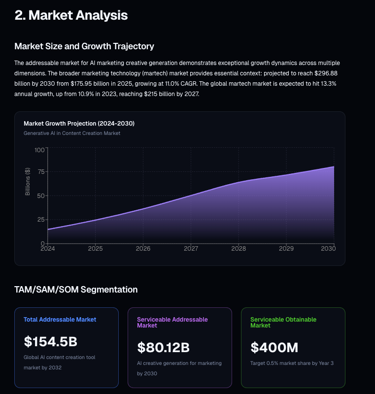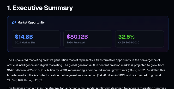 For this example, DeepSky produced a full business plan that covered: