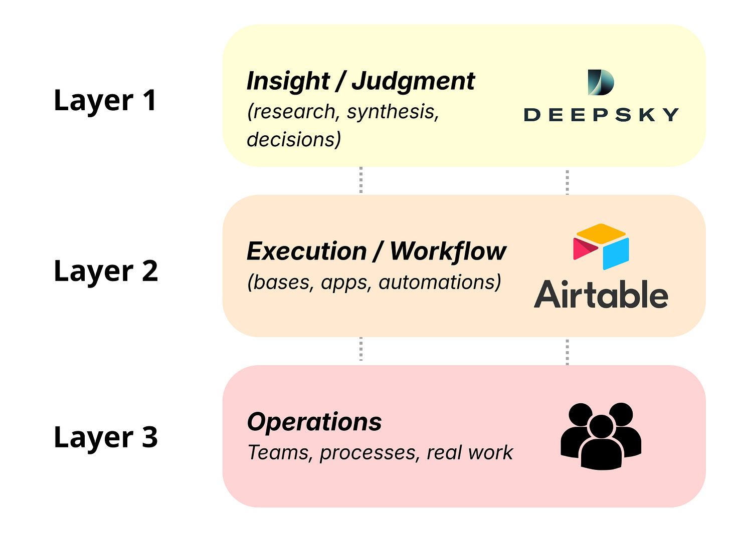 Airtable acquired DeepSky because it solved the hardest part of work before execution: turning ambiguous, messy problems into structured, research-backed decisions. DeepSky operated at the “judgment layer,” not at the output or execution layer—making it a perfect complement to Airtable’s workflow and app-building platform.