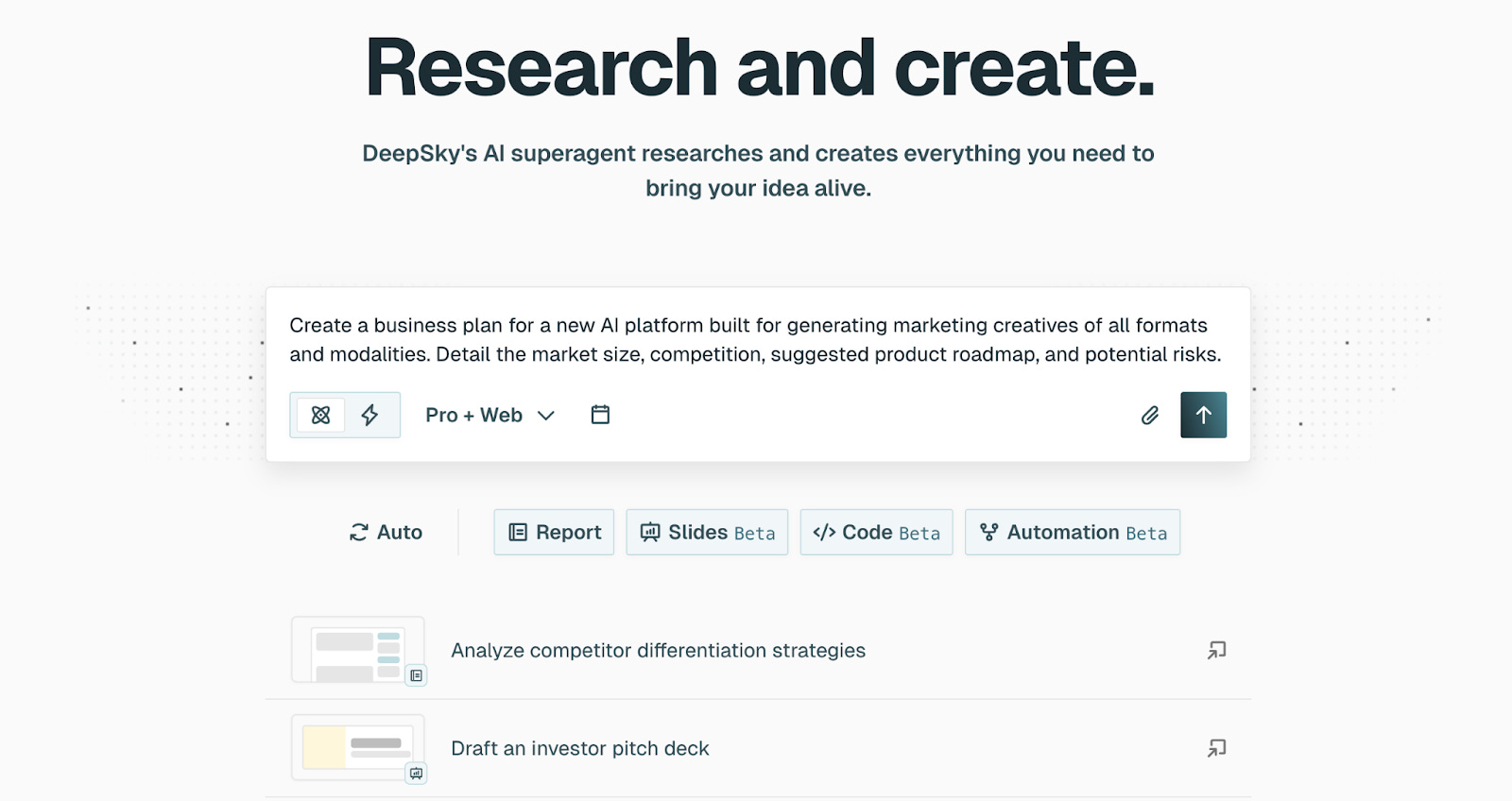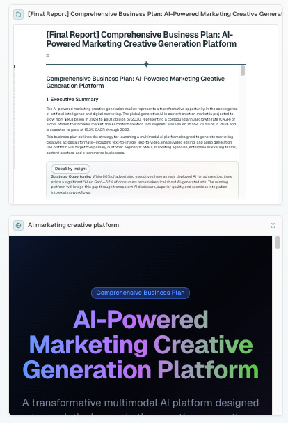 DeepSky produces research reports, business plans, slide decks, and interactive webpages containing charts, graphs, and structured sections. These are presentation-ready deliverables, not drafts.