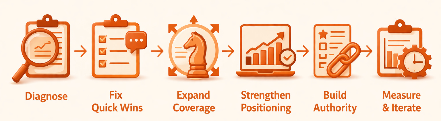 Improve the pages that are already close: page-two rankings, weak CTR, fuzzy positioning, under-optimized money pages.