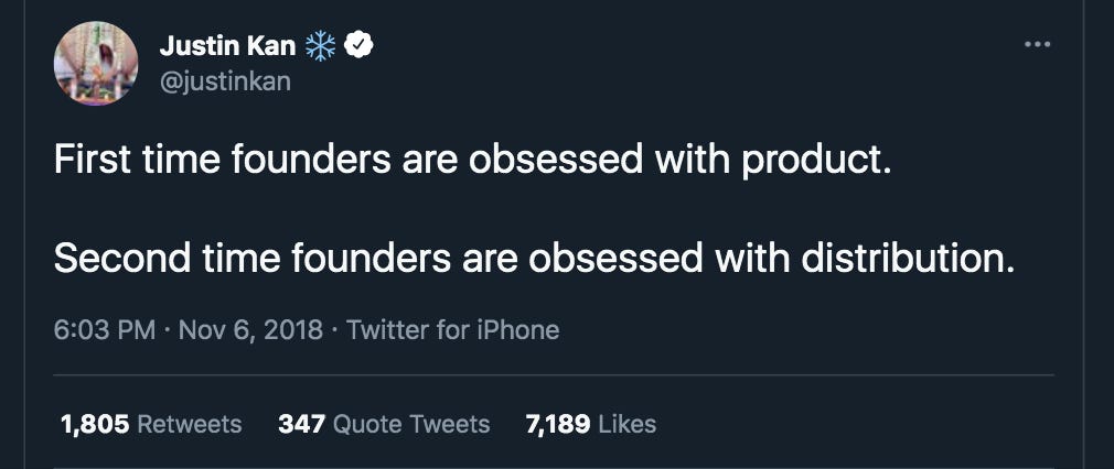Distribution matters more than product, learn to hack it. Become smart at it & build skills. Be curious to learn how other succesful companies get distribution.