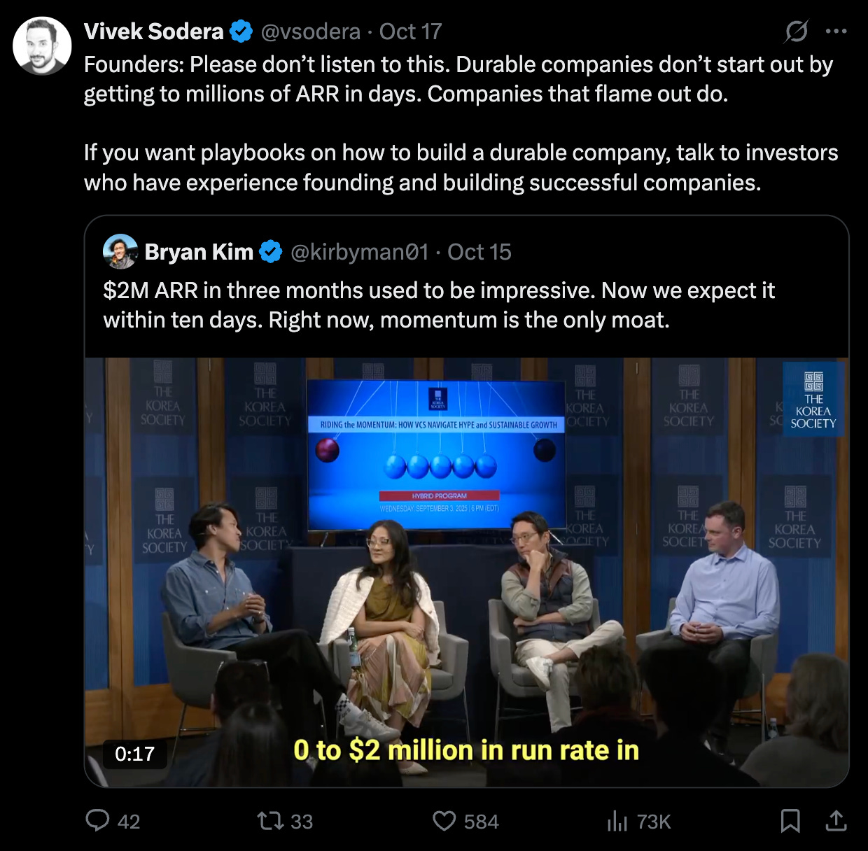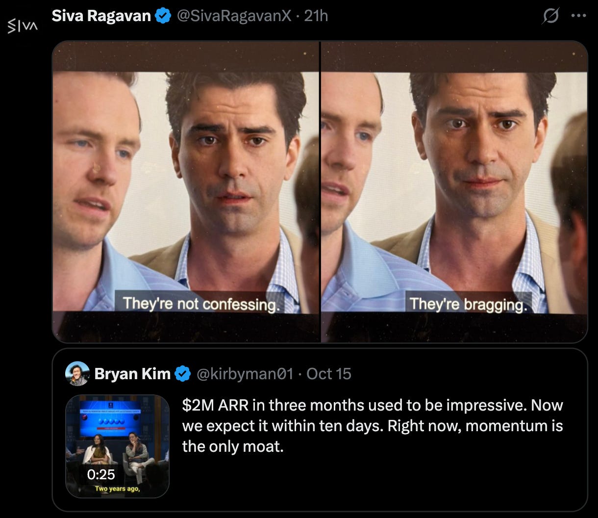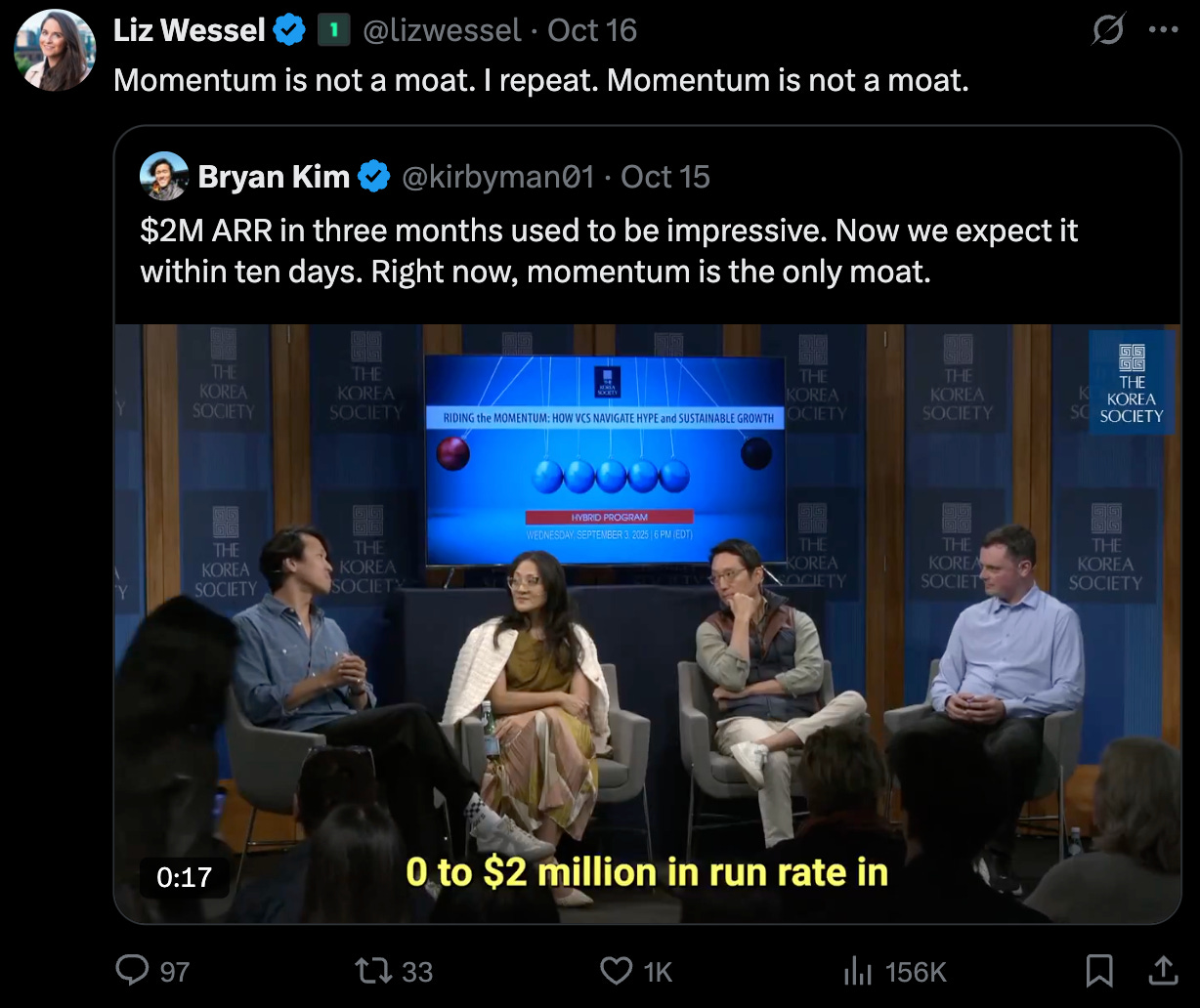 “$2M ARR in three months used to be impressive. Now we expect it within ten days. Right now, momentum is the only moat.”