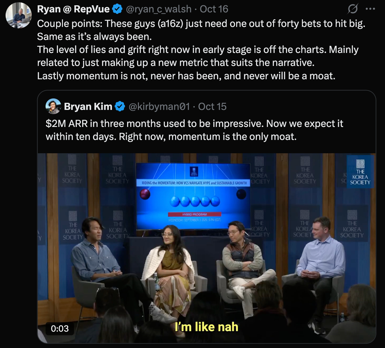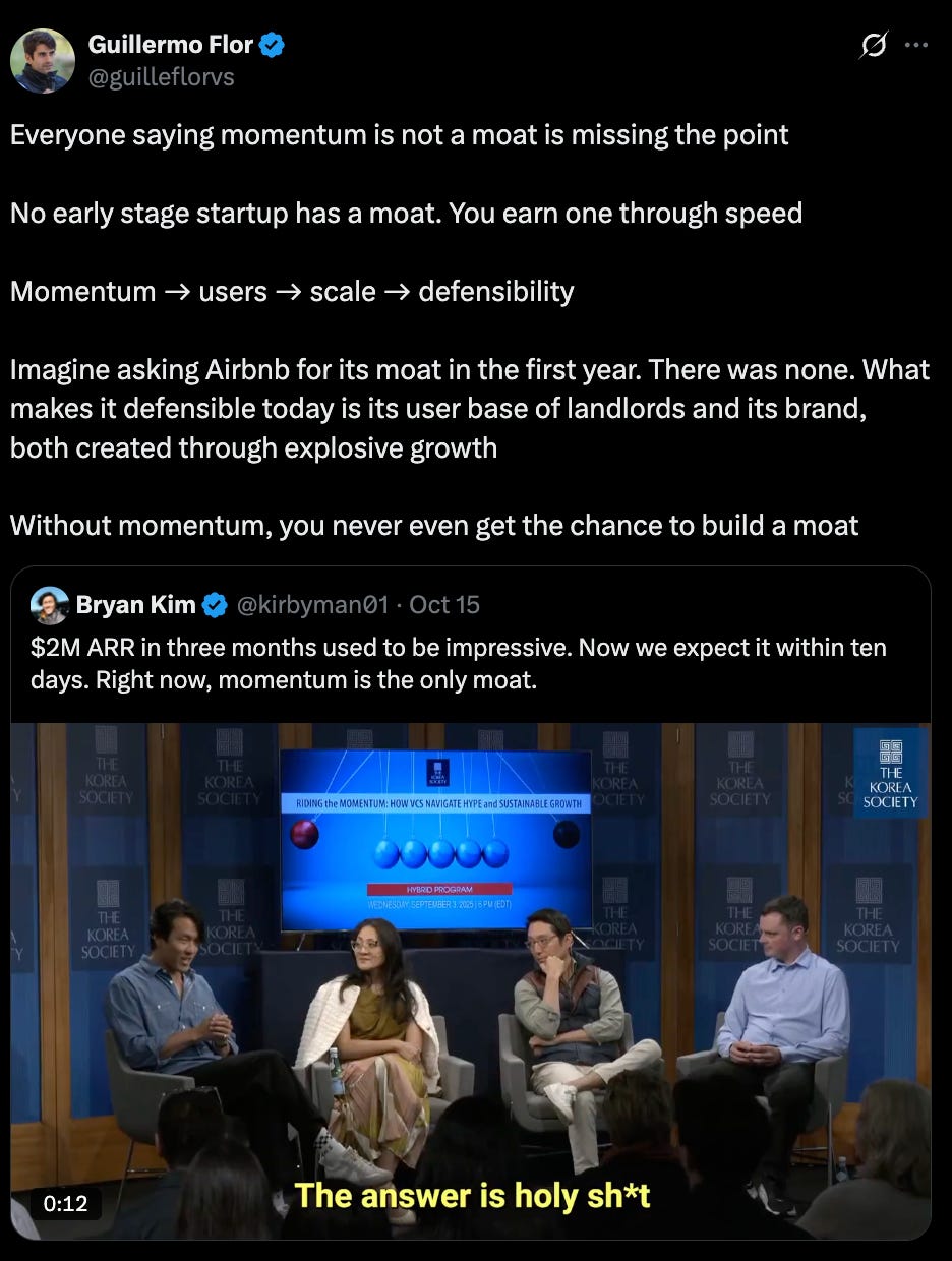 Everyone jumped in saying “momentum is not a moat” and treating it as if Bryan s now just hallucinating new defensibility frameworks out of thin air.
