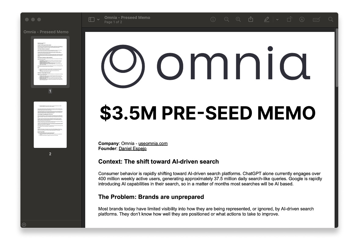 Omnia, a startup building the operating system for brands in the new era of AI-driven search, just raised $3.5M pre-seed from Visionaries Club, the same investors behind Lovable, n8n, Miro, and Personio.