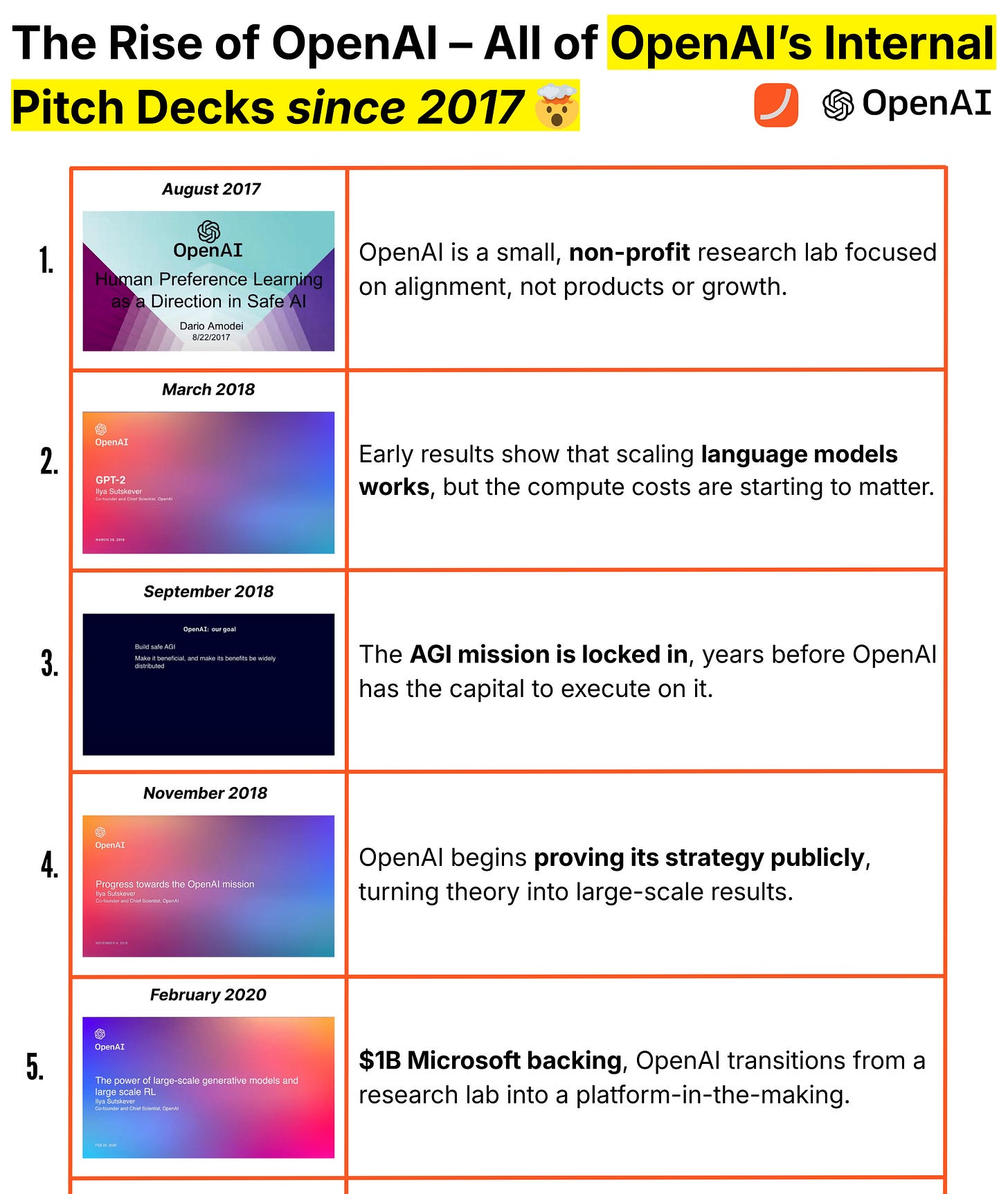 This growth wasn’t accidental. It tracks almost perfectly with the ideas in the decks: the shift to scale, the focus on general systems, the bet on language models, and the long-term AGI mission locked in years earlier.